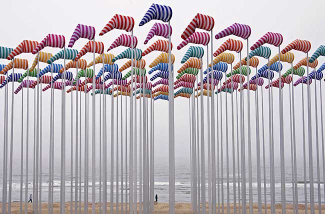 During another frenzied browse of Google images, I stumbled onto this work of French conceptual artist Daniel Buren. It was created for the Beaufort 03 Contemporary Art by the Sea exhibition in De Haan, Belgium. After a heart-thumping moment of exhilaration, I quickly searched for more information about his artwork, and discovered he has a lengthy history with the Guggenheim.